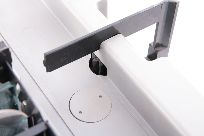 Сохранена обратная совместимость - можно открыть лючок и вставить адаптер для обычной пленки диафильма. На фото адаптер от другого проектора, но принцип понятен.