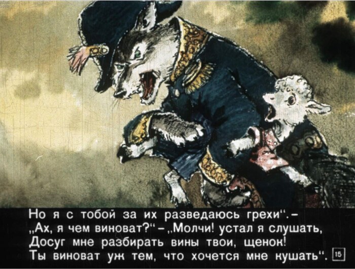 Начал с классики, "диафильмировав" три басни дедушки Крылова. Это были общеизвестный "Волк и ягненок",