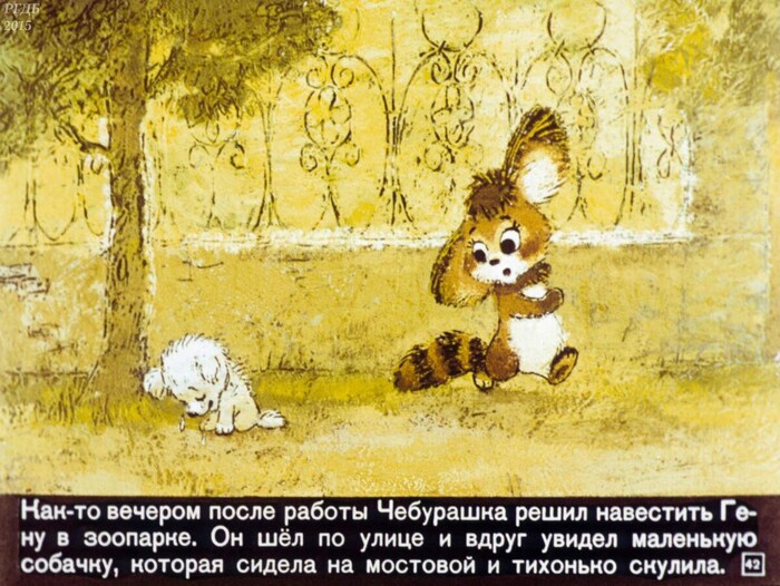 Чебурашку, правда, Степанцев немного подправил, увеличив ему уши - мультипликационный образ Шварцмана уже стал к тому времени каноничным. Хотя длинный пушистый хвост енота "неведомой зверушке" все-таки оставил.