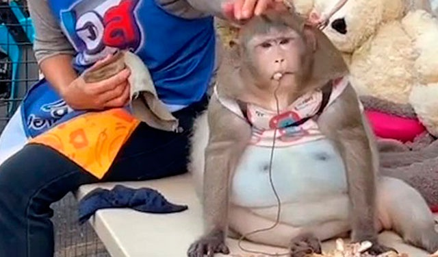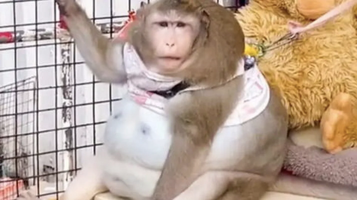 В Тайланде обезьяну откормили до 20 кг. Обычно вес обезьяны составляет 10 кг, но из-за того, что ее кормили нездоровой пищей, она быстро набирала вес. Ее приютил местный лавочник, так как прошлый хозяин ее бросил.