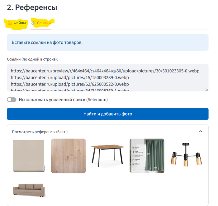 Реальные товары: Можно «скармливать» нейросети прямые ссылки на мебель из магазинов.