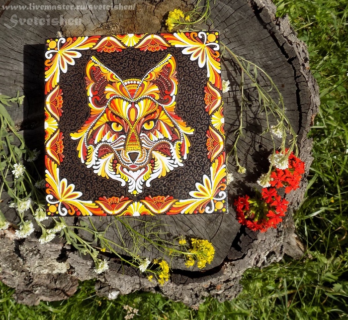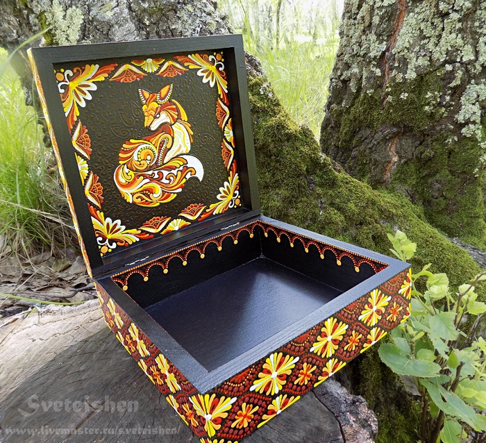 Довольно крупная вместительная квадратная шкатулка (20 см сторона) для украшений, мелочей. Рисовала я, как обычно, акриловыми красками и контурами.