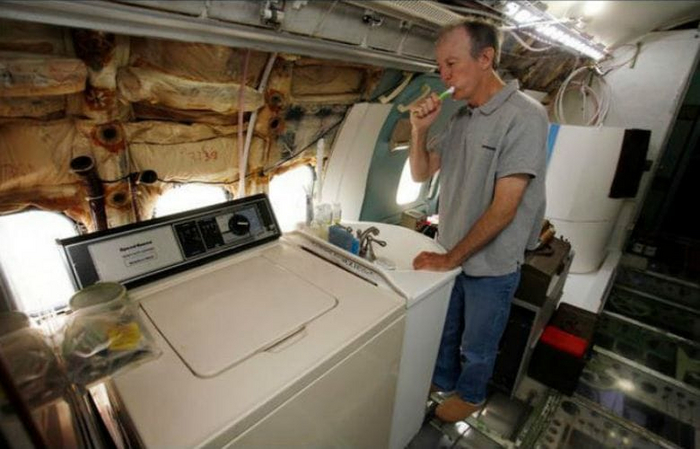 Теперь внутри самолета есть все удобства. Многие оригинальные элементы самолета были сохранены в прежнем виде, например, некоторые из оригинальных сидений и туалет. Кэмпбелл даже добавил стиральную машину и раковину.