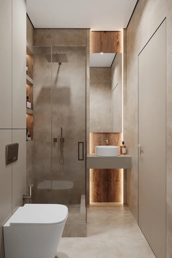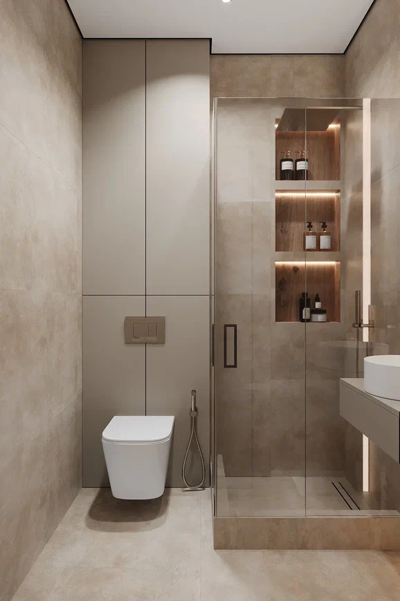 Душевая зона спроектирована компактно и практично, с прозрачным стеклянным ограждением и встроенными нишами. Отделка выполнена в нейтральных оттенках с древесными акцентами, поддерживающими общий стиль проекта. Подсветка в нишах и вдоль вертикальных поверхностей делает использование зоны удобным в повседневных сценариях.