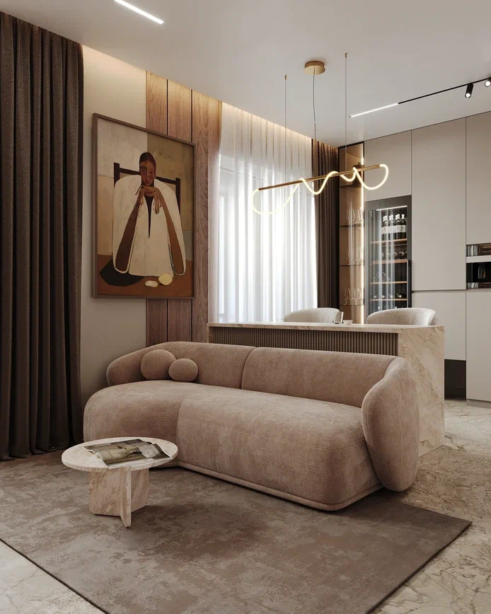 Гостиная сформирована вокруг диванной группы со скульптурной мебелью, которая отделяет зону отдыха от кухни. ТВ-зона акцентирована керамогранитом с подсветкой и дополнена встроенными нишами для хранения и декора. Светлая пастельная палитра, текстиль и древесные фактуры поддерживают современный минимализм с элементами джапанди.