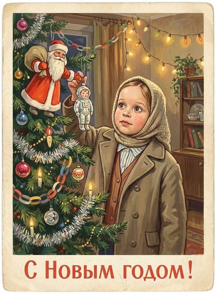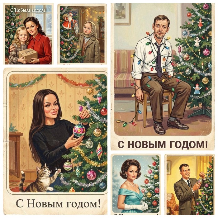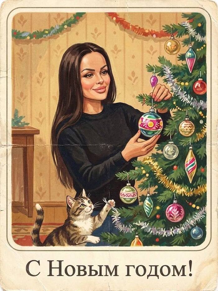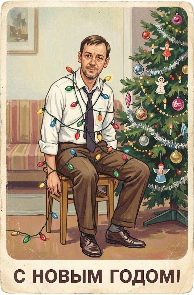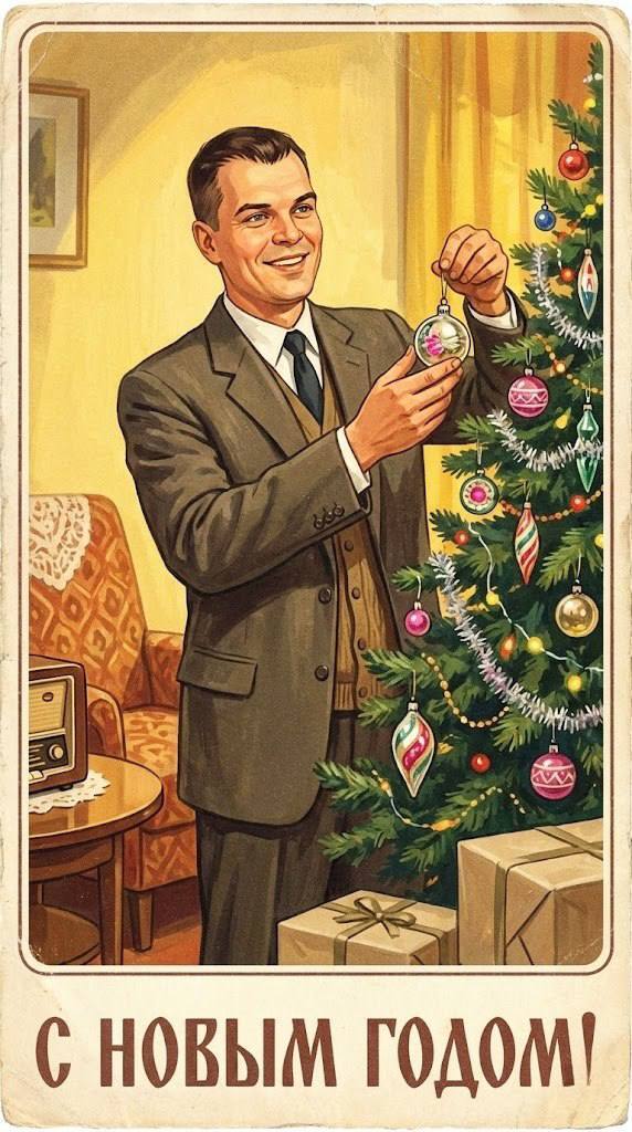 Используй прикрепленное фото как референс. Сохрани человека узнаваемым: лицо, возраст, мимика, пропорции. Одежду перерисуй в советском стиле 1950-1960-х: простой костюм или платье, рубашка, галстук, кардиган, пальто или платок, без современных фасонов и деталей. Преврати сцену в новогоднюю советскую открытку СССР 1950-1960-х: иллюстрация гуашью/темперой, офсетная печать, бумажная фактура, заметная зернистость, слегка выцветшие цвета, легкие потертости, тонкая рамка, округленные углы. Нейросеть сама придумывает добрый праздничный сюжет с легким юмором вокруг этого человека: елка, старые стеклянные игрушки, простая гирлянда, домашний интерьер. Теплый свет, мягкие тени. Добавь крупную надпись кириллицей внизу: "С Новым годом!". Без брендов, без водяных знаков, без английских слов.