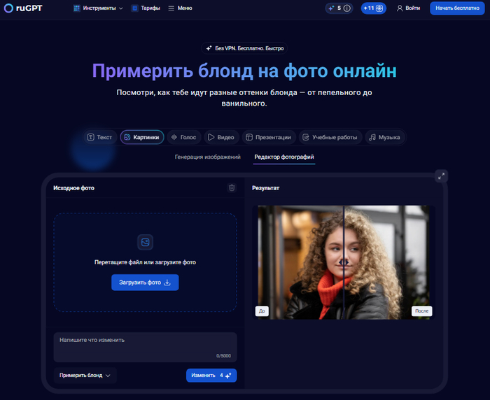 Совет: Подробно описывайте, что именно вы хотите изменить, чтобы получить точный результат. Например, укажите «поменять свет на более тёплый» или «добавить элементы на задний план».