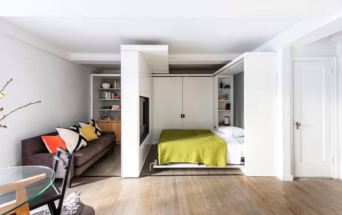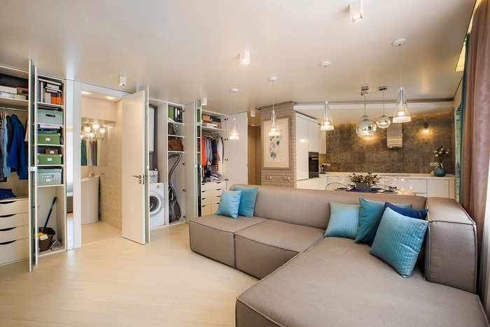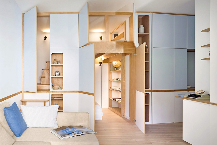 В маленькой квартире шкаф посреди комнаты — непозволительная роскошь. Хранение должно быть либо невидимым, либо формирующим пространство.