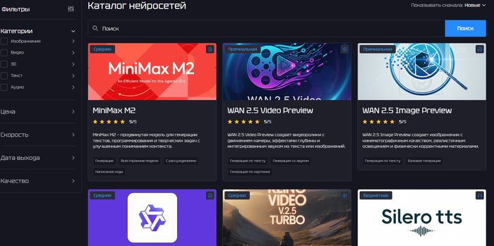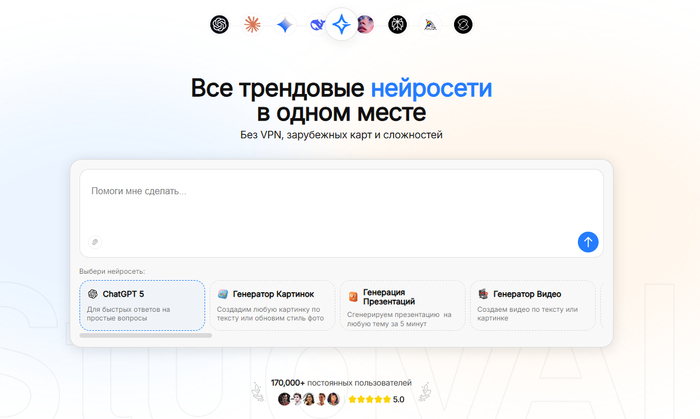 Агрегатор нейросетей и единый кабинет инструментов ChatGPT: в одном сервисе собраны модели для текста, изображений, аудио и видео, включая сам ChatGPT и другие топовые ИИ. Платформа ориентирована на специалистов по контенту, бизнес, маркетологов, разработчиков и всех, кому удобно работать с несколькими нейросетями в одном интерфейсе.