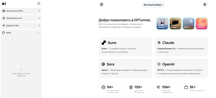 GPTunneL — единый AI-хаб с 100+ моделями и удобной оплатой из России для стабильного доступа к ChatGPT.