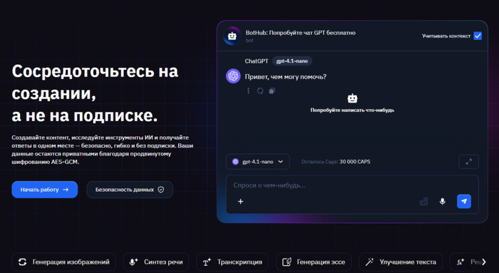 Агрегатор нейросетей и сервис инструментов ChatGPT: в одном аккаунте собраны разные версии ChatGPT и вокруг них — готовые режимы для текстов, кода, изображений, видео, озвучки, транскрибации и анализа документов. Платформа подходит и частным пользователям, и компаниям: можно пользоваться обычным чатом на базе ChatGPT, запускать специализированные GPT-инструменты, работать через веб-интерфейс, Telegram-бот и подключать корпоративный доступ к ChatGPT для команды.