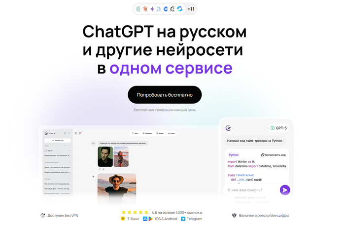 Российский сервис-доступ к ChatGPT, который собирает в одном аккаунте разные версии ChatGPT и другие нейросети, а вокруг них — готовые инструменты для текстов, изображений, видео, музыки и работы с файлами. Сервис подходит студентам, специалистам и бизнесу: можно вести обычный чат с ChatGPT, генерировать статьи, код, презентации, музыку и ролики, а также подключать нейросети к рабочим процессам и CRM.