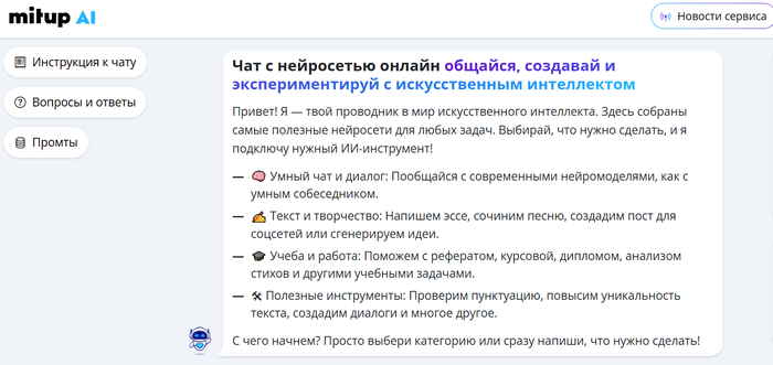 Сервис, который собирает в одном кабинете разные версии ChatGPT и вокруг них строит готовые инструменты: чат для вопросов, генератор текстов, презентаций, изображений, видео и учебных материалов. Платформа ориентирована на студентов, специалистов и бизнес, которым нужен быстрый доступ к ChatGPT-инструментам на русском языке: от решения задач и написания работ до подготовки контента и отчетов.