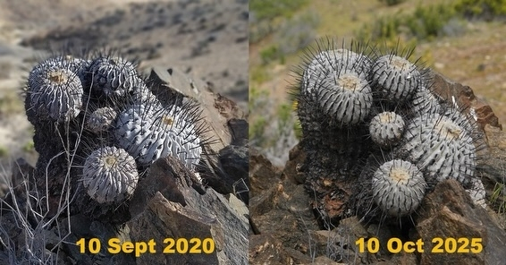 Снимки сделаны - cactaceasdechile, на них запечатлен экземпляр Copiapoa dealbata с разницей в 5 лет. Есть изменения?)