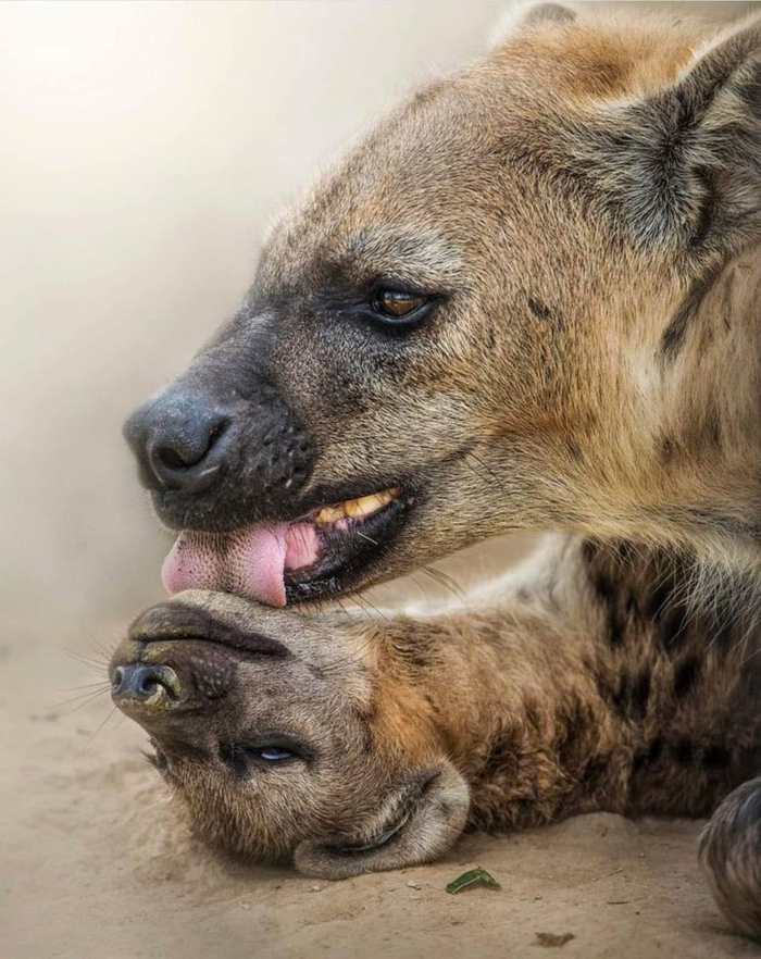 Пятнистая гиена следит за гигиеной детёныша. При их типе питания - вещь совершенно необходимая. Несмотря на то, что гиены обладают феноменальным иммунитетом и целым набором адаптаций (типа бактериального комплекса и устойчивости к ядам) для падалеедения. Язык у пятнистых гиен, и впрямь кошачий, он не менее шершав, нежели, скажем, у львов, и позволяет «выковыривать» из шкуры мельчайшие кусочки пищи.