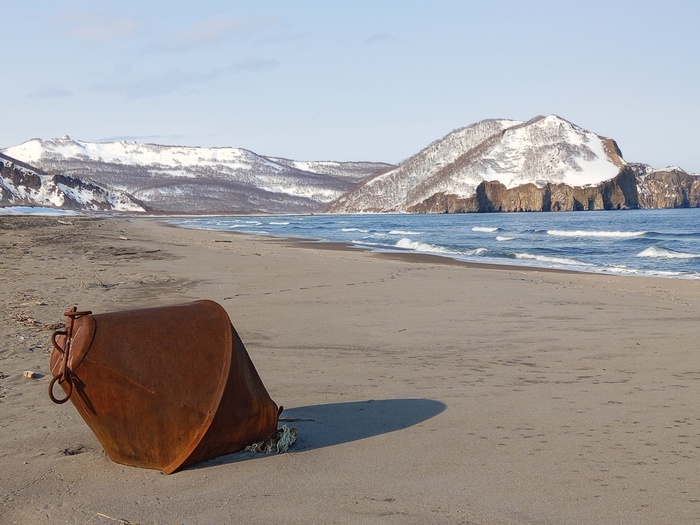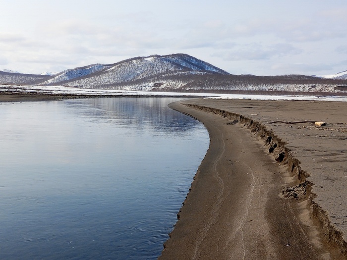 После обеда на Камчатке выглянуло солнце, и я не утерпел. Рванул на прогулку, на океан. 10 км на машине по снежной колее, потом на лыжах по льду пресного озера, с потом еще 5 км по пляжу бухты Спасения (Тихий океан, Авачинская губа). Дошел до устьев озера Вилюй.