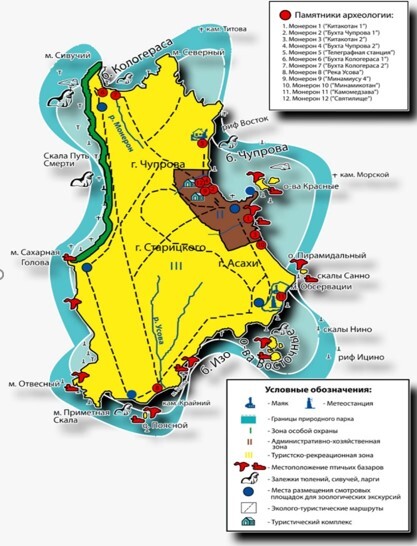 Но не только природа делает остров особенным. Здесь сохранились следы разных эпох: древние стоянки, заброшенные поселения, русские и японские кладбища (в прошлом остров принадлежал Японии). Среди зарослей бамбука можно обнаружить руины старых построек и одичавшие фруктовые сады. Чтобы ощутить дух прошлого, стоит пройти по каменному мосту, возведенному японцами много веков назад, и затеряться в лабиринте местных ущелий.