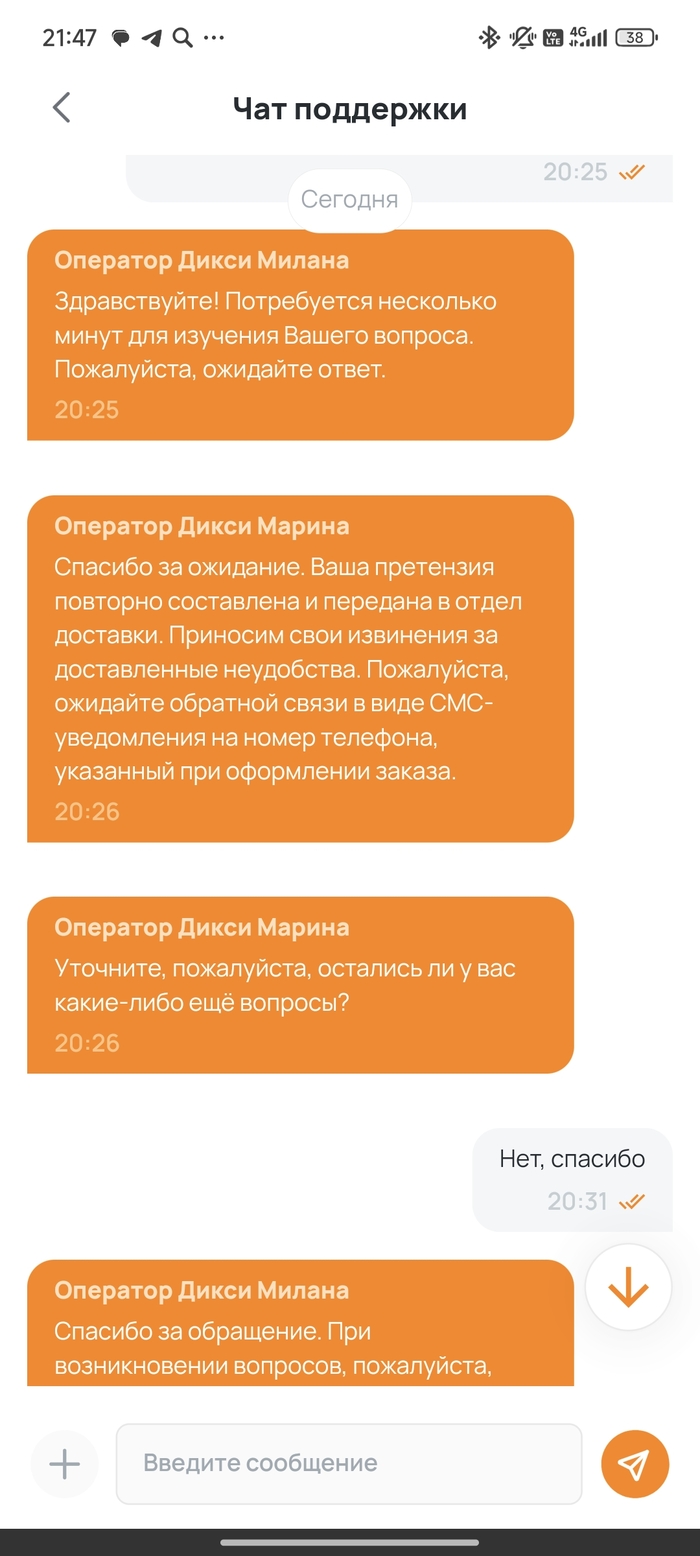 У меня такая же ситуация, 02.10.2025 сделала заказ в Дикси. Собирали очень долго, потом привезли только воду и два лимонада. Сняли сразу 778 р. 2 мороженых, 3 коробки конфет, сахар, багет, кофе не привезли. Писала им в приложение в чат поддержки, отвечает робот. Потом на почту прислали письмо, что нет причин для возврата. Люди, не заказывайте в Дикси никогда, потеряете деньги, время и ничего не докажете. Больше никогда там не буду заказывать.