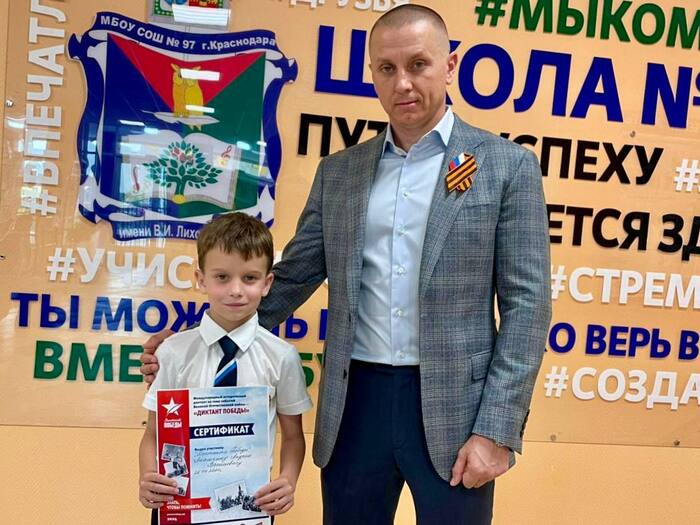 Сегодня председатель Комитета по строительству, градостроительной и архитектурной деятельности Гордумы Краснодара Андрей Анашкин вместе со своим старшим сыном Иваном принял участие в масштабной международной акции «Диктант Победы». Акция состоялась в том числе и в МОУ СОШ №97, расположенной в семейном квартале «Достояние».