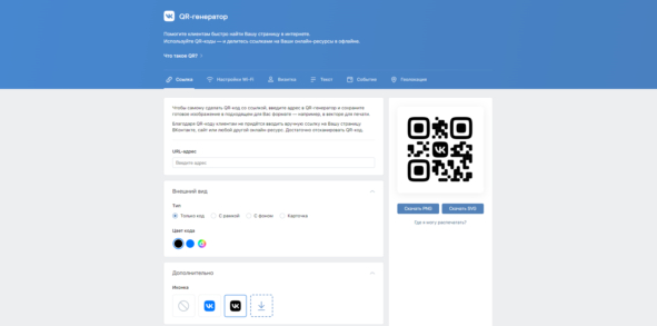 Еще один простой и понятный русскоязычный инструмент для генерации QR-кодов. Имеет удобный интерфейс и базовые возможности кастомизации.