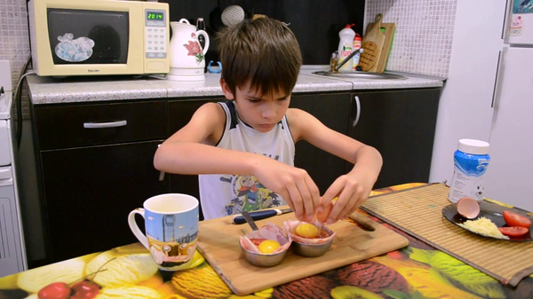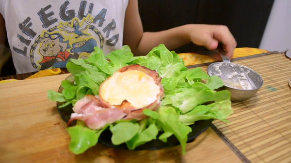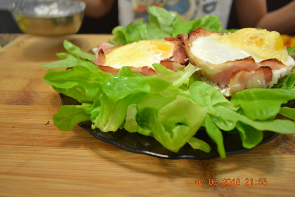 Для приготовления такой яичницы понадобится яйца,бекон,помидор,сыр и салат для украшения.