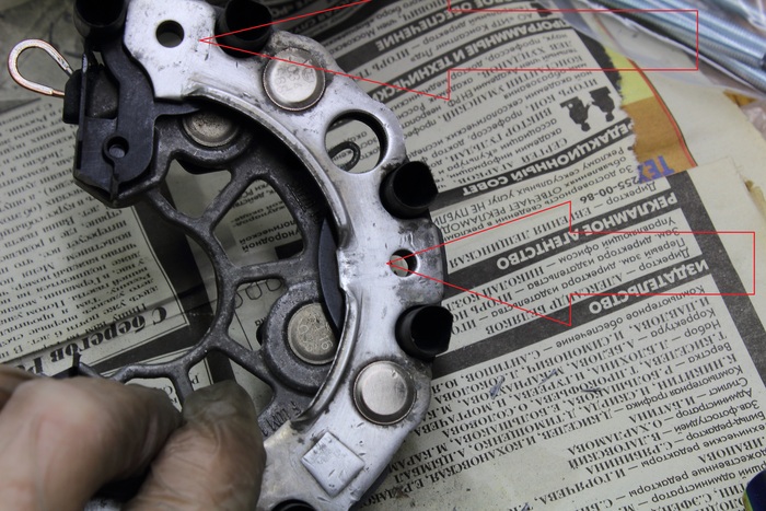 Зачищаем до блеска точки контакта диодного моста с задней крышкой