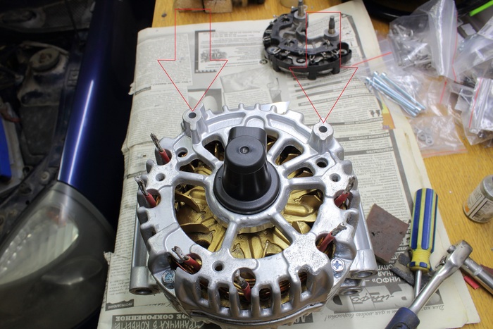 Ставим на место диодный мост и прикручиваем его тремя винтами. Поджимаем петельки контактов с выводами обмоток пассатижами и пропаиваем.