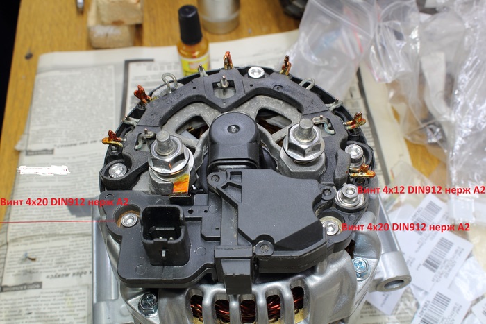 Болт крепления диодного моста к задней крышке использовал такие-Винт 5х20 DIN 912 нержавейка А2 под внутренний шестигран+ шайба плоская 5 DIN125 нержавейка А2