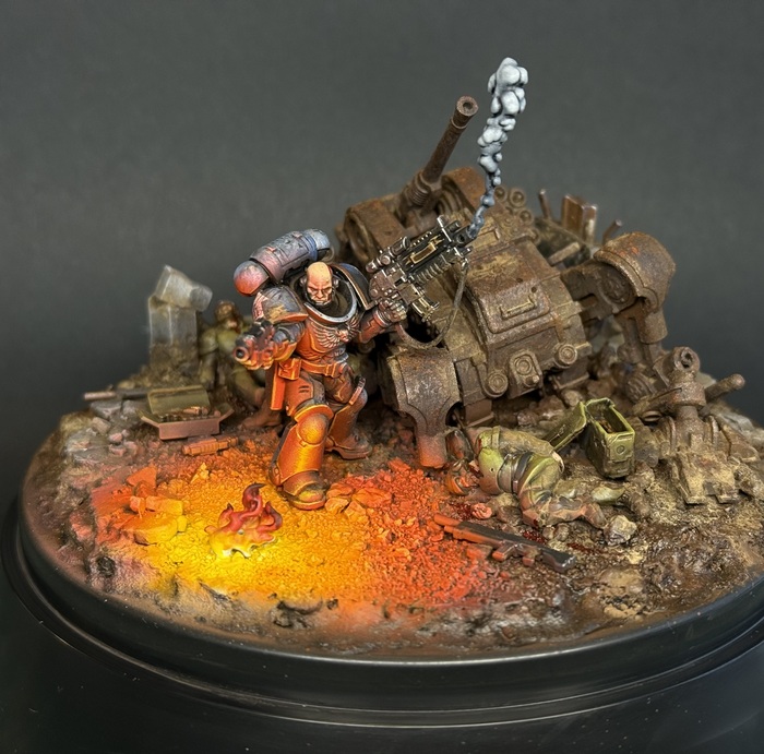 Основа для диорамки это напечатанный на 3Д принтере контур, туда вложен кусок пенополистрола, сверху уже текстурные пасты, там где асфальт зернистая, где трава обычная. Если зернистую пасту подшлифовать немного после высыхания получается очень читаемая текстура асфальта. Следом окрас, трава на ПВА и пигменты, и гильзы от перестрелки. Сам гелик покрыл не матовым лаком, а полуматом, полированный как с салона он явно не смотрелся. Красил в основном МИГОМ и джим скейлом, на некоторых местах подошла палитра Брилл и Ганзы.