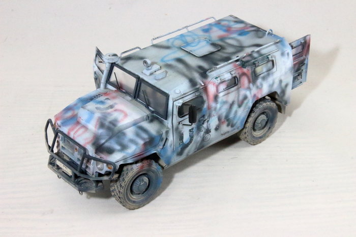 Хочу поделиться своей диорамой, неожиданно превратившейся в долгострой. В начале, всё задумывалось как часть миссии из Таркова «Сафари на тигра», это бронеавтомобиль Тигр в цветах ООН изрисованный граффити.