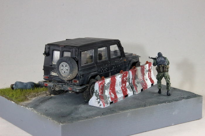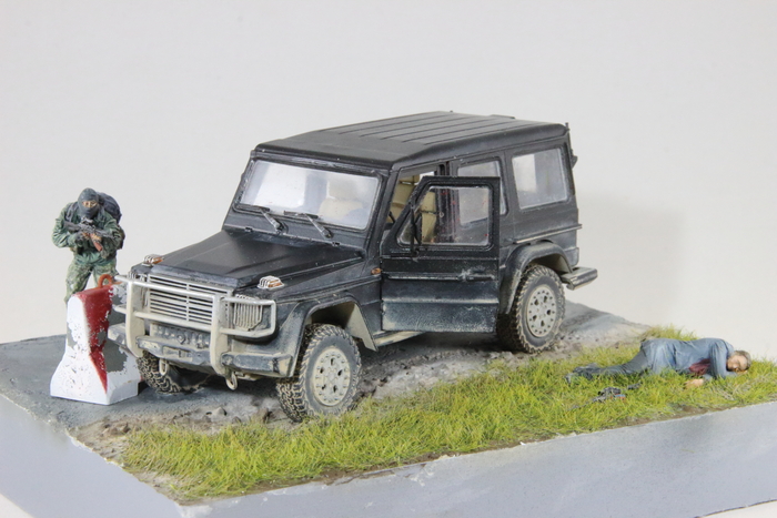 И тут как раз мне на глаза попался Gelandewagen от Neverland. И решил поменять на расстрелянный гелик, как раз встречал на таможне около общежития, рядом «отдыхал» дикий, а из гелика вывалился сейф и оргтехника. На модели машины пришлось заделать посадочное место антенны, оформить нутрянку и положить внутрь сейф. Как и на скриншоте сделал следы от пуль на правой части, изначально подпилил пластик изнутри, потом напротыкал его как мог. С первой фигуркой, нападающего проблем не было, подходила идеально по стилю, а вот вторую я уже не стал переводить на милитаризированные рельсы, пусть остаётся гражданским, тут уже «либо хорошо, либо никак».