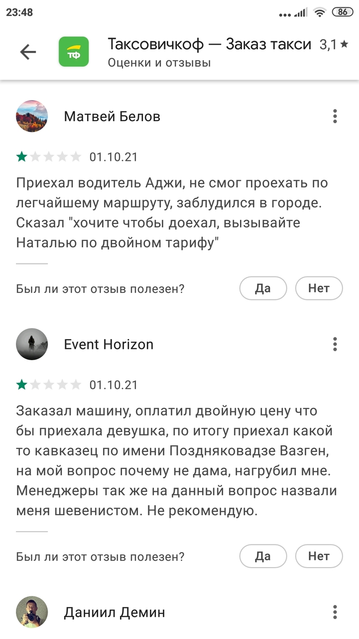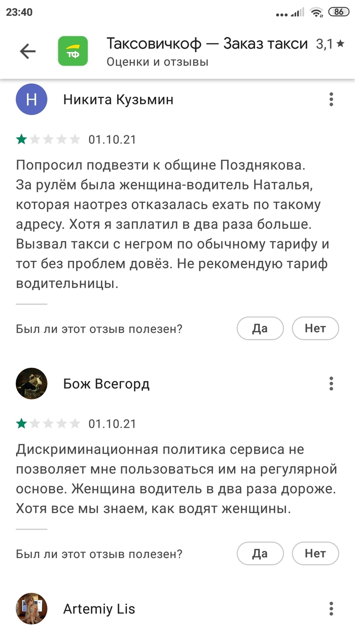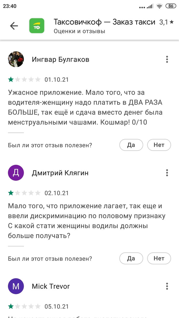 Заглянул на плеймаркете в приложение Таксовичкоф, а там вереница радостных отзывов о новой опции - баба-таксист, тариф двойной.