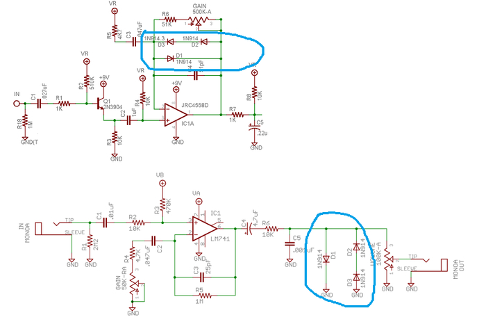 В дальнейшем схемы дисторшн несколько усложнились. Для смягчения ограничения сигнала и большей похожести на плавное ограничение в усилительных лампах увеличилось количество диодов и их число часто было разным для положительной и отрицательной полуволн сигнала.