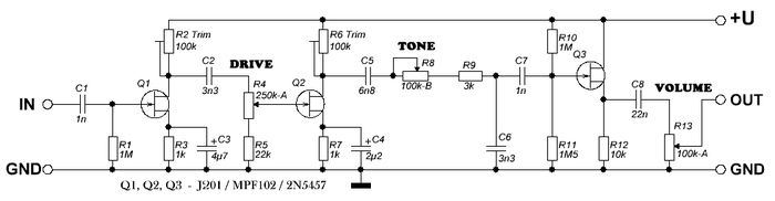 Примерная электрическая принципиальная схема (прототип) дсторшн на полевых транзисторах