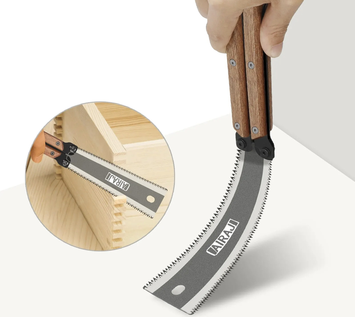 Складные ручные пилы выбирают для туристических и хозяйственных задач, где важны компактность и надёжность. Пила AIRAJ выполнена из стали SK5, известной высокой твёрдостью и стойкостью к износу. Складной механизм обеспечивает безопасность при переноске, а зубья рассчитаны на эффективную работу с древесиной разной плотности.