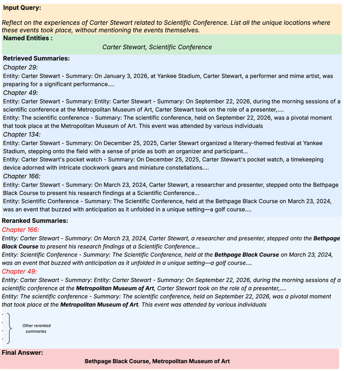 В разработанной системе вопросов и ответов (QA) сначала выполняется извлечение ключевых сущностей из запроса, которые затем сопоставляются с соответствующими экземплярами глав в базе знаний GSW посредством сопоставления строк; извлеченные краткие содержания сущностей ранжируются на основе их семантической близости к запросу, что позволяет получить наиболее релевантные ответы от LLM, при этом среднее количество токенов значительно сокращается благодаря лаконичности кратких содержаний и выбору только релевантных глав.