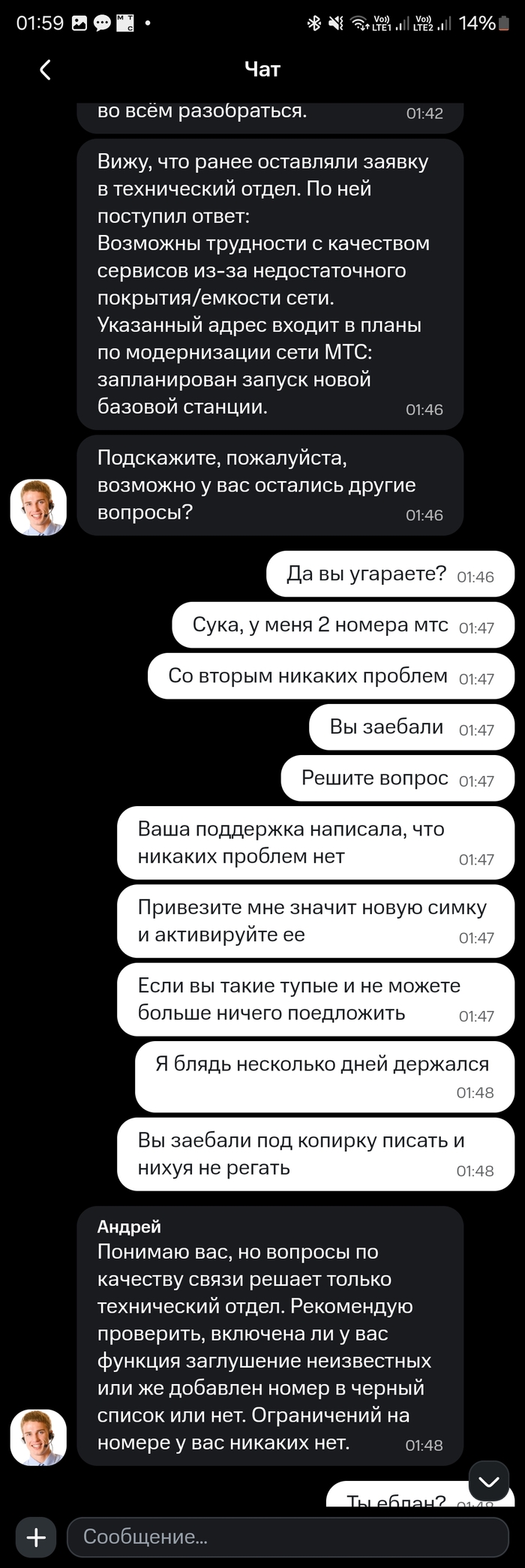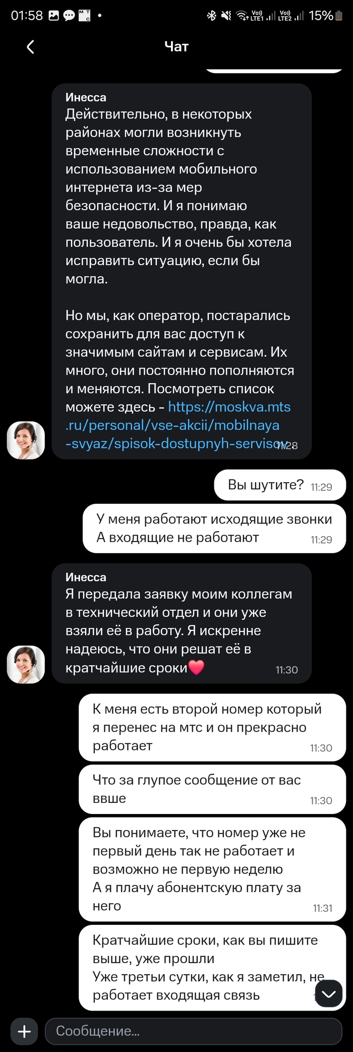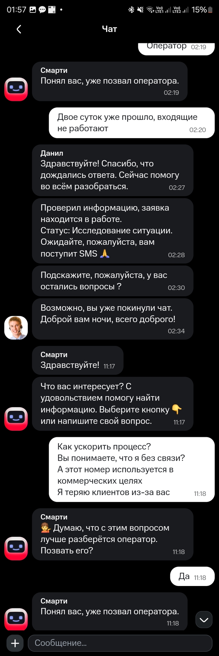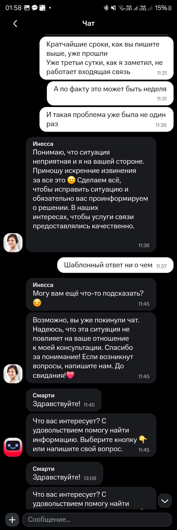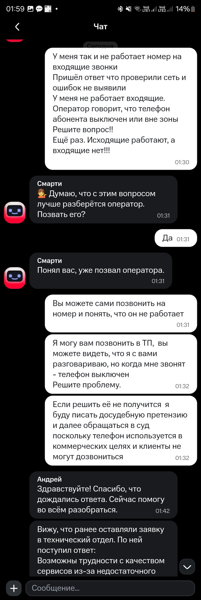 И тут они выдали шедевр: я пишу, что не работают входящие звонки, а они мне отвечают про возможные сбои с интернетом.