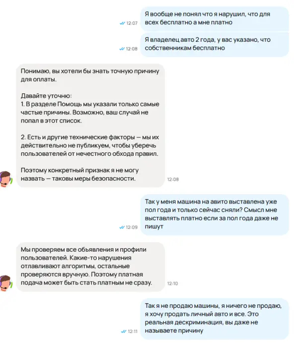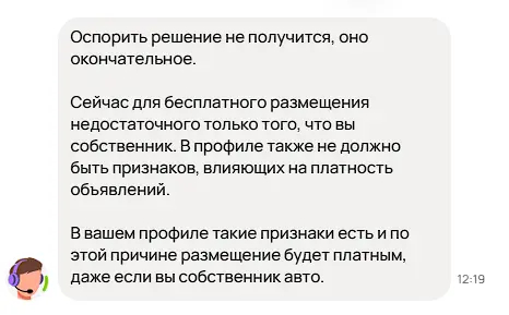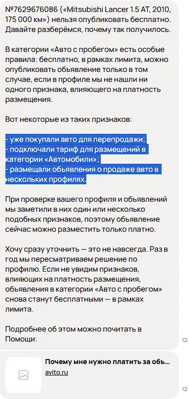 После разблокировки я выставил авто уже со своего профиля, провисев пару дней его снова удаляют и просят 5000 рублей за размещение, написал в поддержку, предоставил все доказательства, что машина уже более 1.5 года во владении и не продавалась на авито, мне пропустили объявление бесплатно как собственнику.
