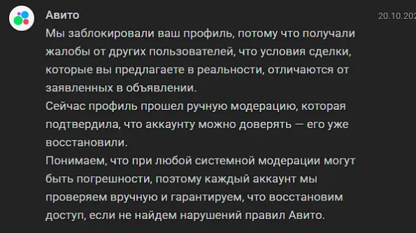 Раннее, ровно год назад я пытался с ЕДИНСВТЕННОГО профиля выставить авто, которым владею ~год. Машина провисела какое то время и аккаунт у меня просто заблокировали без разъяснения причин. В итоге после месячного бодания с ними на vc ru (https://vc.ru/claim/1557414-opyat-avito-blokiruet-akkaunty), они извинились и разблокировали мне профиль после ручной проверки, хотя рьяно утверждали, что я что-то там нарушил.