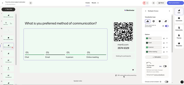 Одним из самых популярных инструментов для проведения опросов, викторин и интерактивных презентаций является Mentimeter. Он позволяет создавать презентации с интерактивом: добавлять опросы, создавать облака слов, устраивать квизы. Такие интерактивные элементы позволяют собирать обратную связь от аудитории при проведении конференций, проводить контроль знаний в обучении в вузе или школе, вовлекать слушателей при проведении презентаций.