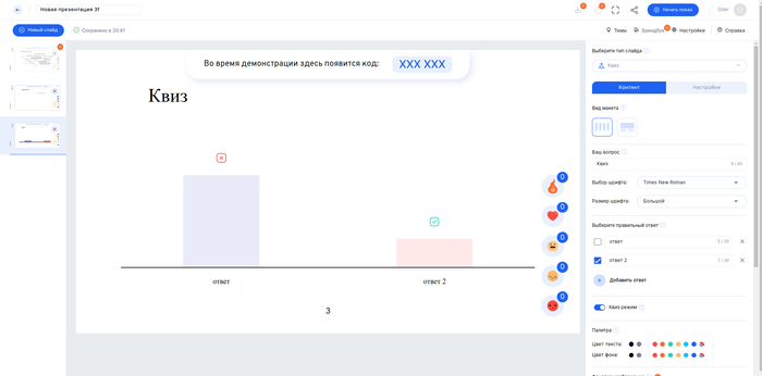 создавать классические презентации, комбинировать их с викторинами и опросами;