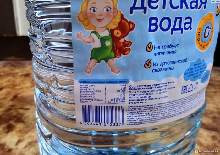 Настоящая вода для детей, добыли из артезианской скважины. Нам повезло, что не пришлось её кондиционировать (подгонять состав под состав детской воды).
