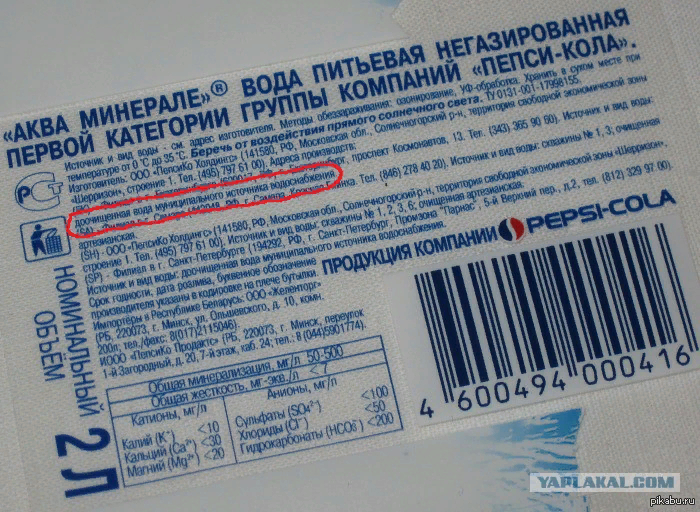 Налили из водопровода, очистили, чтобы вы не отравились, добавили минеральчиков (см. табличку).