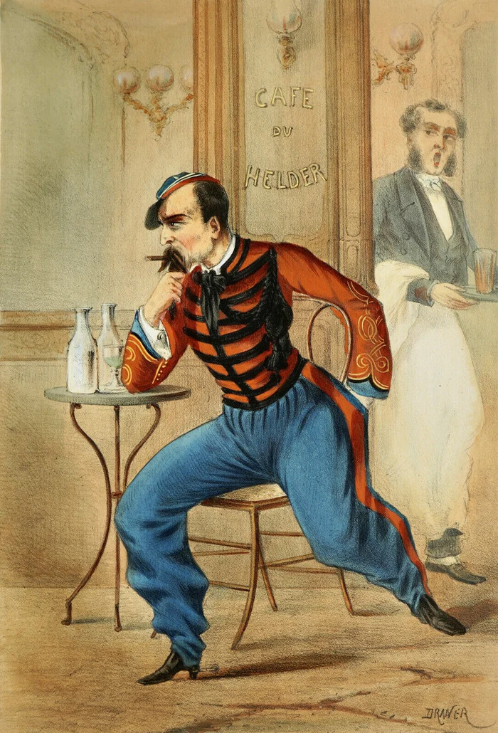 5. Алжирский кавалерист из спаги-полка. Вроде бородка соответствуют тогдашней моде, но вот излишне длинные усы выдают товарища, привычного больше равняться на Турцию. Где, как известно, не сильно жалуют крепкий алкоголь. Однако, если присмотреться, то видно бокал с опаловым содержимым. Что неоднозначно указывает на абсент. Который становился опаловым после того, как в него наливали минеральную воду (французский способ потребления полынной настойки). То есть мы видим французский вариант истории про то, как приезжий мусульманин кушает на выезде в России шашлык из свинины.
