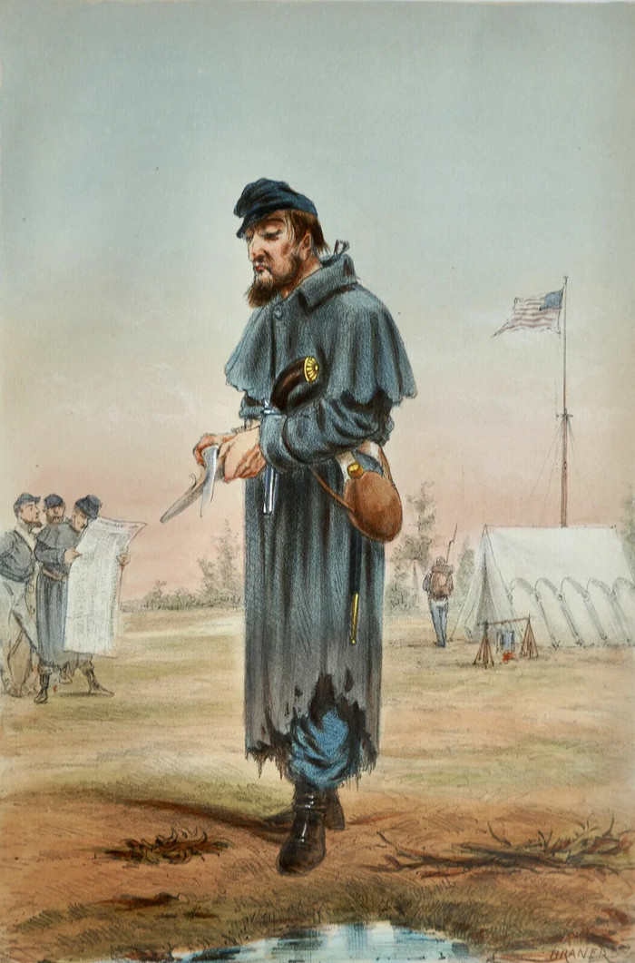 6. Американский пехотинец. В ту пору Америка воспринималась как глубочайшее захолустье. Поэтому солдатик строгает палочку – такой намек на его фермерское происхождение. И на плохое финансирование армии – плащ драный, практически нищенский. А на дальнем плане солдатики читают огромную портянку какой-то газеты – намек на страсть американцев к газетной полемике.