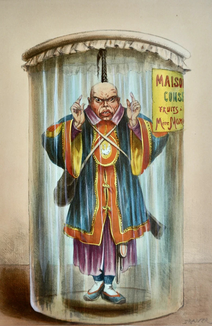 9. Китайский резервист. Образ трактован практически буквально – китаец заспиртован на манер дарвиновской лягушки. Что дополнительно намекает на увлеченность общества всякими китайскими диковинами.