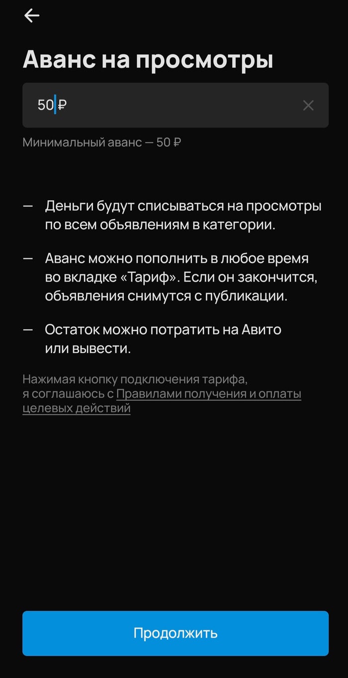 Таким образом под понятием "категория" я всю дорогу понимала категорию своего объявления, которое собиралась оплачивать! Прикинув, я решила опробовать этот новый тариф. Кроме того, было указано, что просмотр стоит «от 0,1 р». Я понимала, что «от 0,1 р» не значит 0,1 р. Но Авито предложил выставить лимит расходов в день, я установила минимальную сумму 100 р, решив, что в худшем случае просто лишусь ее и не буду больше этим тарифом пользоваться.