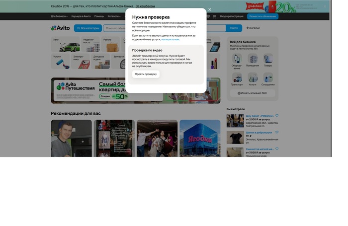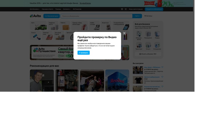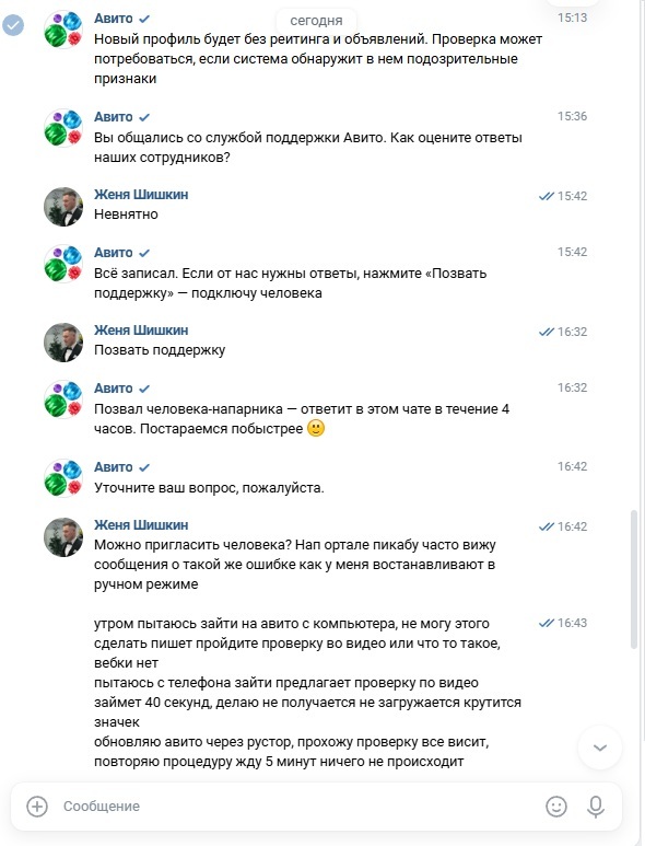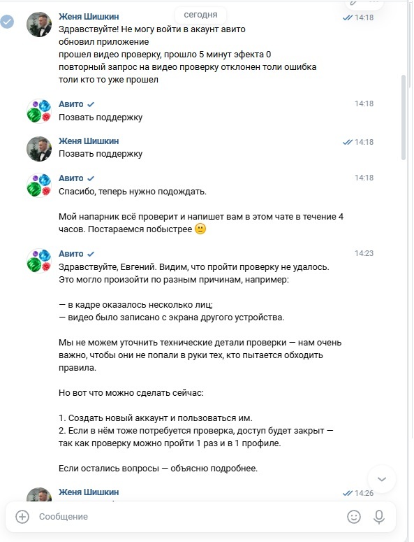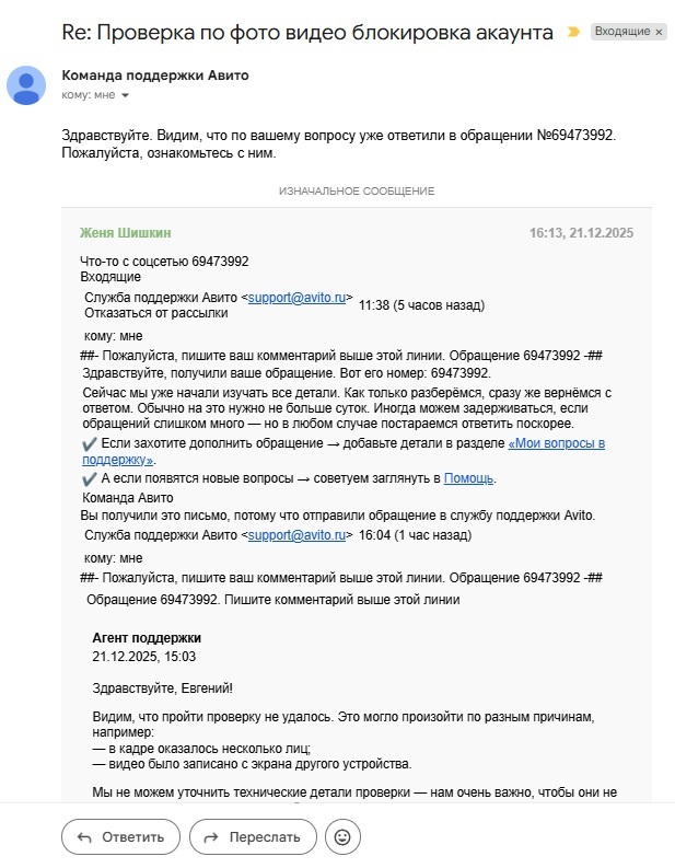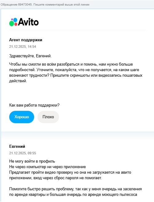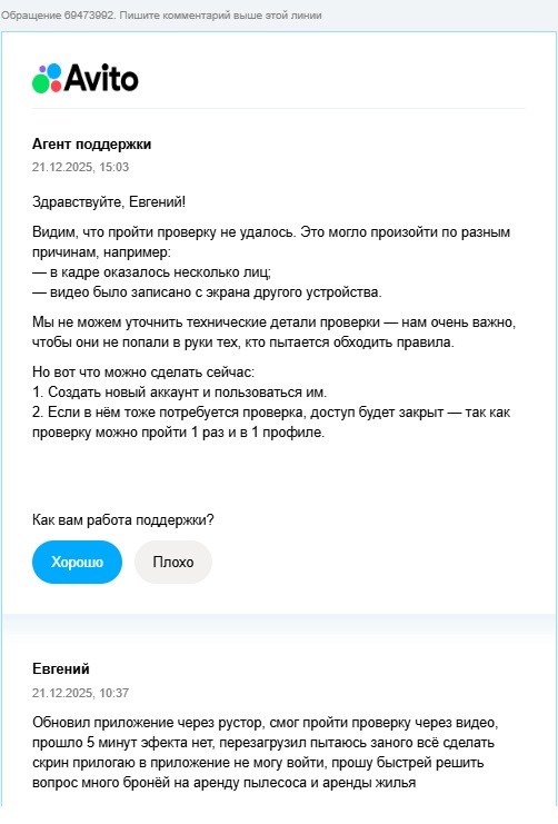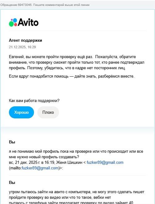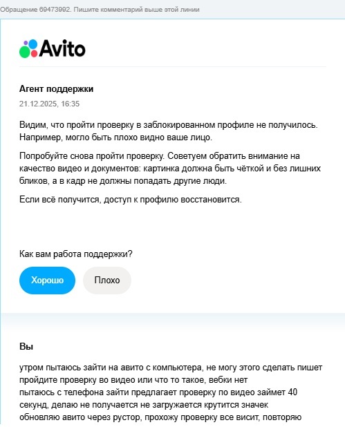 Всё произошло 21.12.25. Утром пытаюсь зайти на авито с компьютера, не могу этого сделать пишет пройдите проверку во видео, вебки нет.Пытаюсь с телефона зайти, предлагает проверку по видео (займет 40 секунд), делаю не получается, не загружается,крутится значек. Обновляю авито через рустор, прохожу проверку все висит, повторяю процедуру жду 5 минут ничего не происходит. Бью тревогу, пишу в поддержку ВК в авито, недвижимость авито, емейл. профиль очень важен, более 500 отзывов!