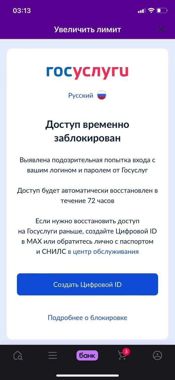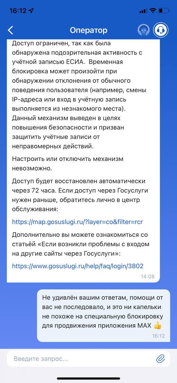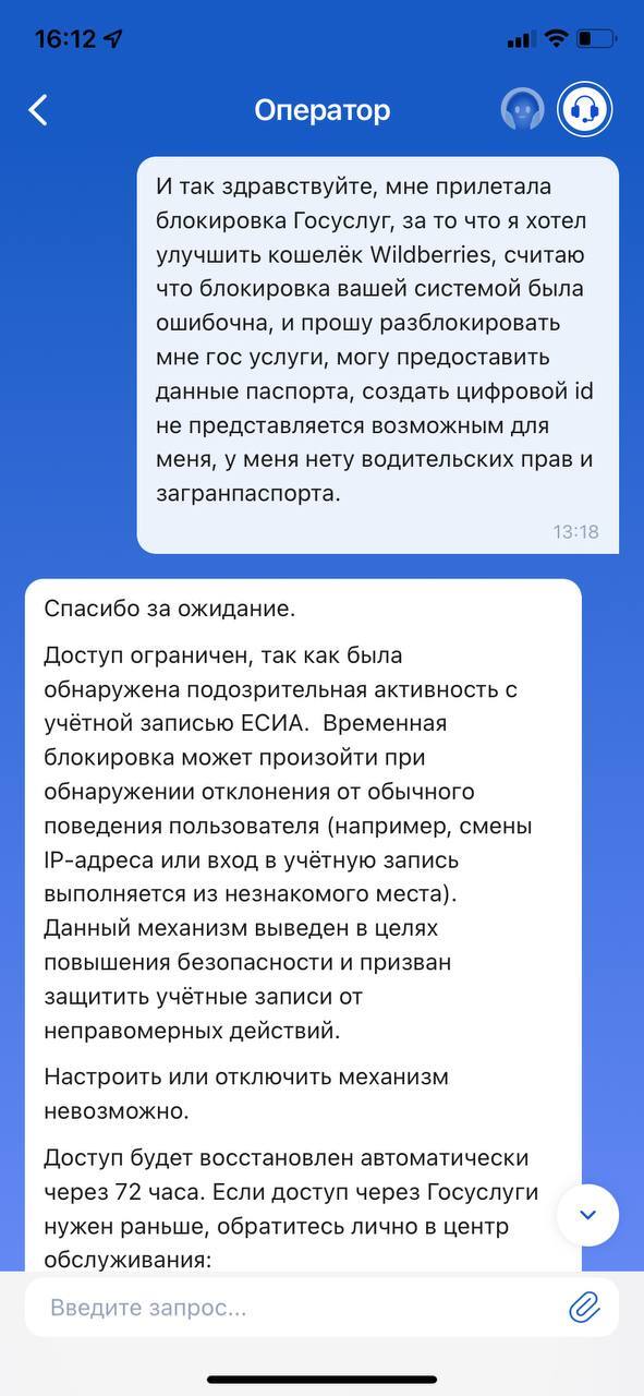ГОСУСЛУГИ заблокировали мне доступ на 72 часа за улучшения кошелька Wildberries Я как человек обратился за помощью в поддержку, написав что это ошибка и предложил предоставить данные паспорта доказав что за аккаунтом я и попросив о разблокировке! Думаю разумным будет придать это огласке так как это выглядит прямым принуждением использования стороннего приложения MAX для разблокировки ГОСУСЛУГ. Предлагая два варианта для разблокировки, создание цифрового ID в приложении MAX либо же явиться самостоятельно в центр в обслуживания (почему нельзя удалённо написать свои данные паспорта и снилс неизвестно)