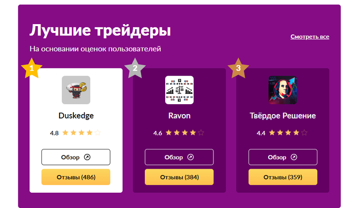 Трейдеры эти меняются ровно раз в неделю, но аватарка остается прежней у всех. На первом месте ниндзя с каким нибудь замысловатым названием на английском, потом весы с названием попроще, и потом иконка со стрелочкой вверх и названием из 2х русских слов. Если вы перейдете в разбор любого трейдера отсюда, весь негатив сайта внезапно сменится на милость, а вместо сурового поиска доказательств вам разумеется предложат поверить на слово что ребята работают давно, и отзывы у них хорошие, тут же снизу будет 3-5 сотен накрученных рандомных отзывов в духе все найс, залетайте кто хочет. При этом в интернете вы найдете еще пару статей написанных на коленке про этих трейдеров неделю назад.